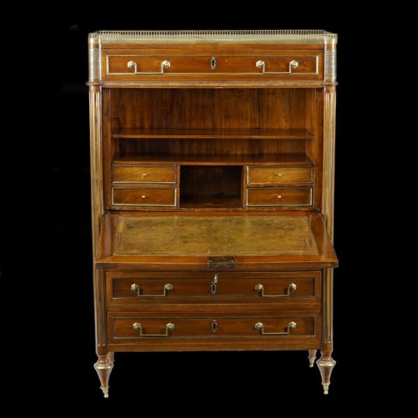 piano rettangolare in marmo bianco delimitato da una ringhierina in bronzo con un cassetto sottostante, fronte a calatoia celante tiretti e scomparti vari e ulteriori tre cassetti , 140x90x37 cm.