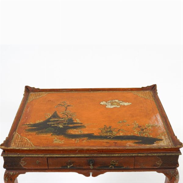 decorato con motivi di chinoiserie, piano rettangolare poggiante su fascia ad un cassetto e gambe di linea sagomata, provvisto di vassoio estraibile con piano in vetro, difetti, 57x75x54 cm.