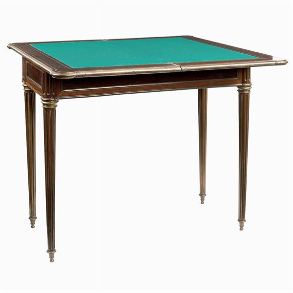 filettato in metallo con motivi geometrici, piano apribile con interno parzialmente rivestito in panno da gioco verde, poggiante su gambe tornite e scanalate, difetti, 77x88x88 cm. (aperto), 77x88x44cm. (chiuso)
