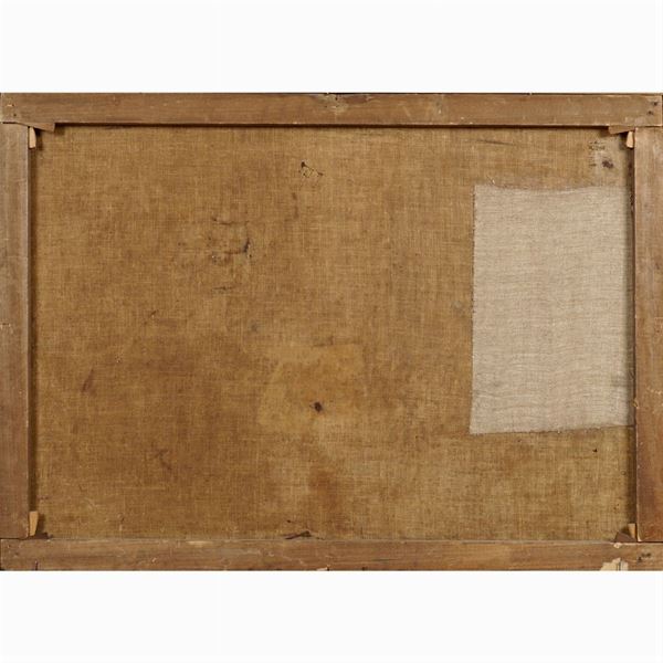 "Natura morta di frutta, ortaggi e vaso di fiori" olio su tela, entro cornice, 68x94 cm.