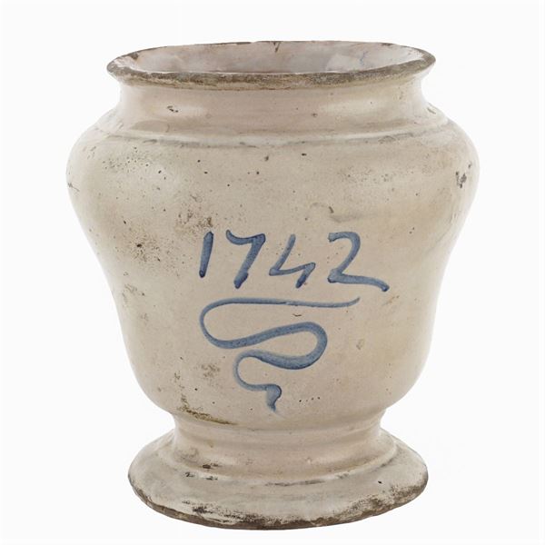 corpo di linea sagomata, dipinto a raffigurare un paesaggio e volute vegetali, lievi difetti, h. 21 cm.