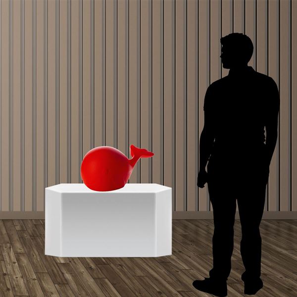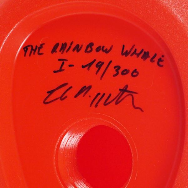 "The rainbow whale", colore red edizione Italia ( I ) es. 19/300, scultura in plastica, firmata, numerata e titolata sotto la base. Autentica dell'artista su fotografia, 30x60x30 cm.