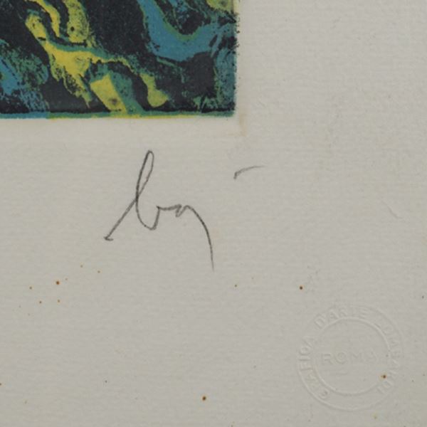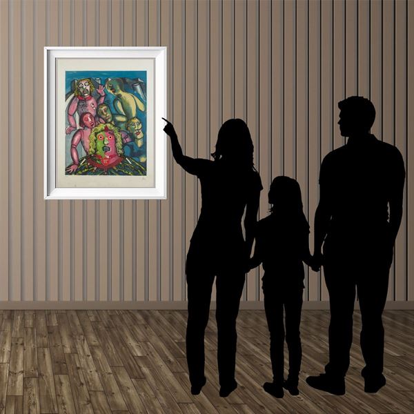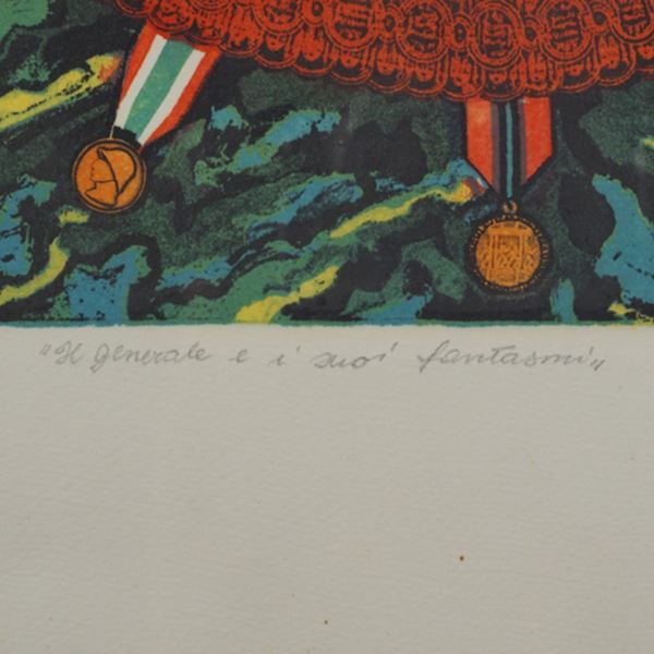 "Il generale e i suoi fantasmi", 1980, litografia a colori es. 51/120, firmata in basso a destra, titolata al centro, entro cornice, 80x60 cm.