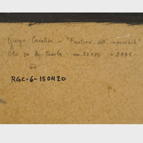 "Frontiera dell'impossibile", 2001, olio su tavola, siglato in basso a destra, 24x85 cm.