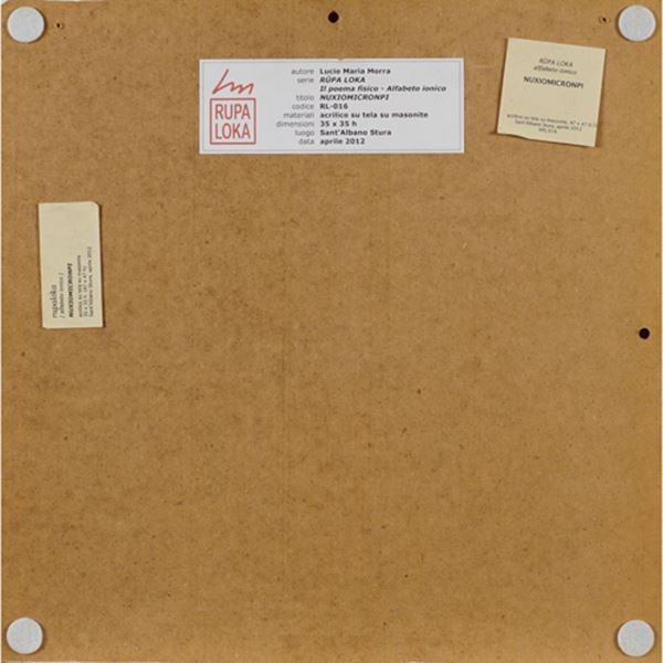 "Nuxiomicronpi- serie Rupa Loka" 2012, acrilico su tela applicata su masonite, autentica dell'artista su foto, 35x35 cm.