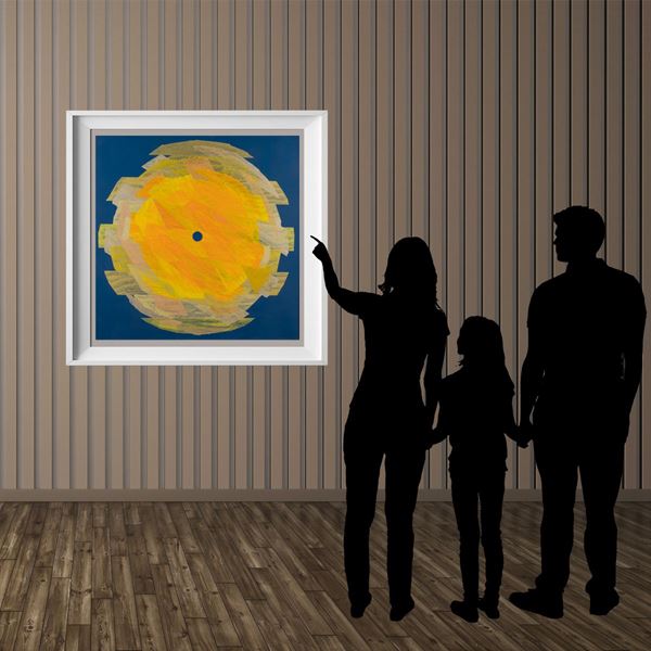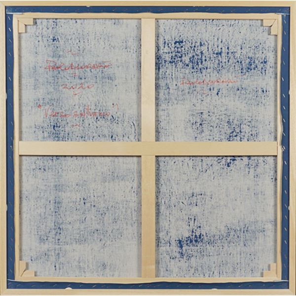 "Verso Saturno", 2020, tecnica mista su tela, firmata, datata e titolata sul retro, entro cornice, 89x89 cm.