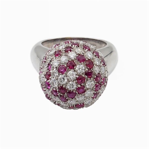 diamanti taglio brillante ct 2 circa alternati da rubini tondi ct 0,60 circa, misura 14, peso 15,7 gr.