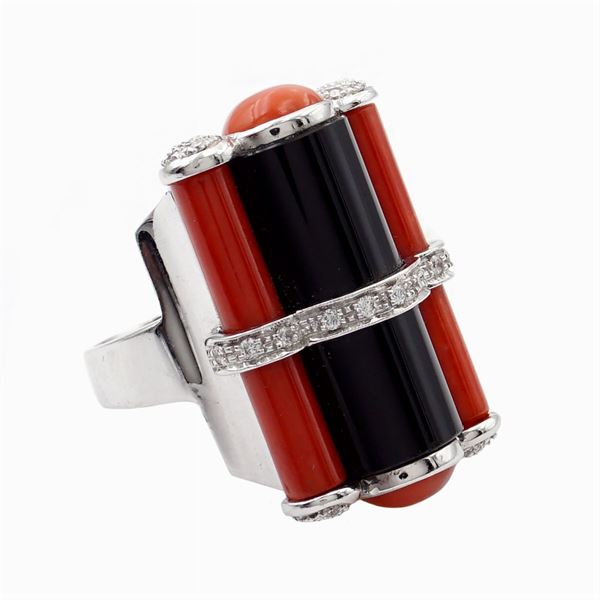 tagliati a sezioni cilindriche impreziositi da diamanti taglio brillante ct 0,30 circa, misura 17, peso 20 gr.