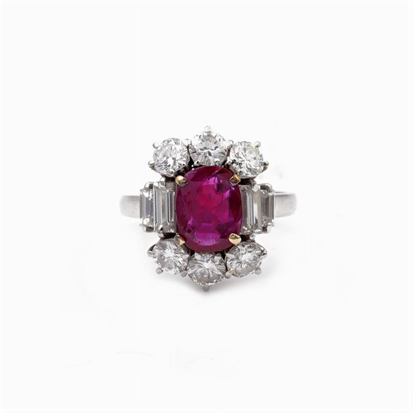 ct 1,60 circa contornato da diamanti taglio brillante e baguettes disposti a gradazione ct 1,30 circa, misura 7, peso 5,9 gr.