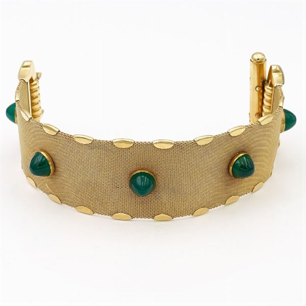 maglia a retina impreziosita da cinque crisoprasi taglio cabochon ct 12 circa, chiusura a scomparsa a motivo geometrico completo di catenina di sicurezza, lunghezza 21 cm., peso 90 gr.