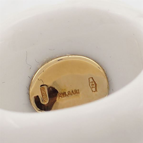 in ceramica bianca e oro giallo 18kt con tormalina rosa taglio ovale cabochon, firmato all'interno del gambo, misura 11, peso 10,5 gr.