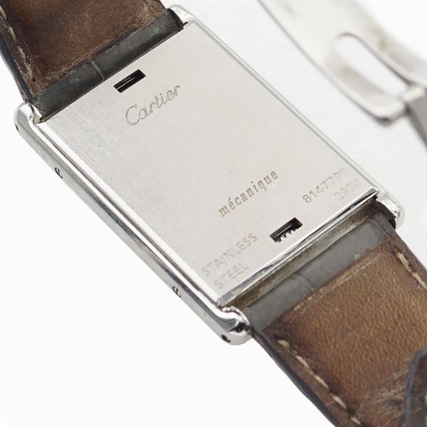 in acciaio, cassa rettangolare 24x35 cm. ref. 81477PB 2390, quadrante bianco guilloché con numeri romani, vetro zaffiro, movimento meccanico a carica automatica, cinturino originale in pelle con chiusura deployante, cassa, quadrante e movimento firmati, .