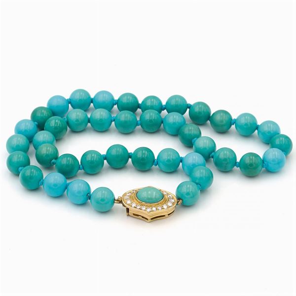 tagliati a sfere di 10 mm. circa, chiusura in oro giallo 18kt con diamanti taglio brillante ct 0,60 circa centrata da un turchese taglio cabochon, lunghezza 47 cm., peso 68 gr.