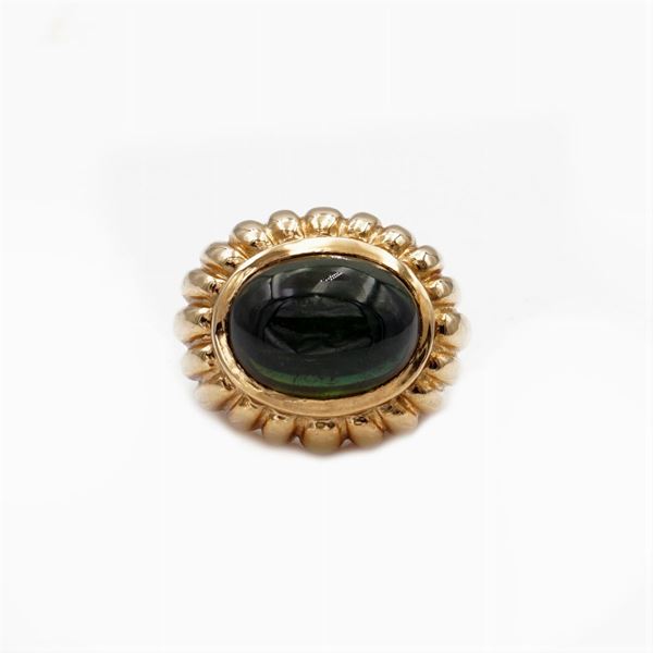 baccellato con incastonata una tormalina verde taglio cabochon, firmato all'interno del gambo, misura 6, peso 34,8 gr.