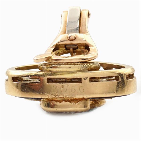 due acquamarine e due diamanti tagliati a cuore  ct 0,60 circa contornati da diamanti taglio brillante ct 0,70 circa e onice nero, lievi difetti, firmati e numerati sul retro n. C766, peso 14,3 gr.