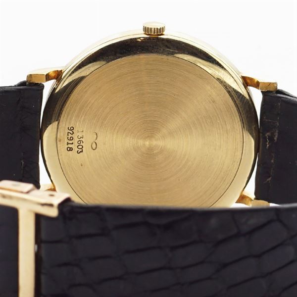 in oro giallo 18kt, cassa 33 mm. ref.13603 - 92918 quadrante dorato con indici, datario ore 3, movimento meccanico a carica automatica, cinturino in pelle con chiusura deployante in oro giallo, cassa quadrante e movimento firmati