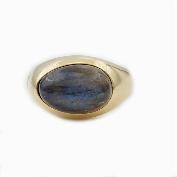 in oro giallo 18kt con incastonata labradorite taglio a goccia cabochon, firmato sul gambo, misura 16,5, peso 15 gr.