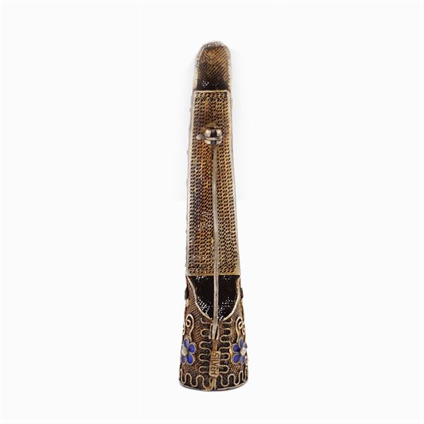 in argento dorato a retina decorata con fiori in smalto policromo, coralli e turchesi taglio cabochon, peso 14,2 gr.