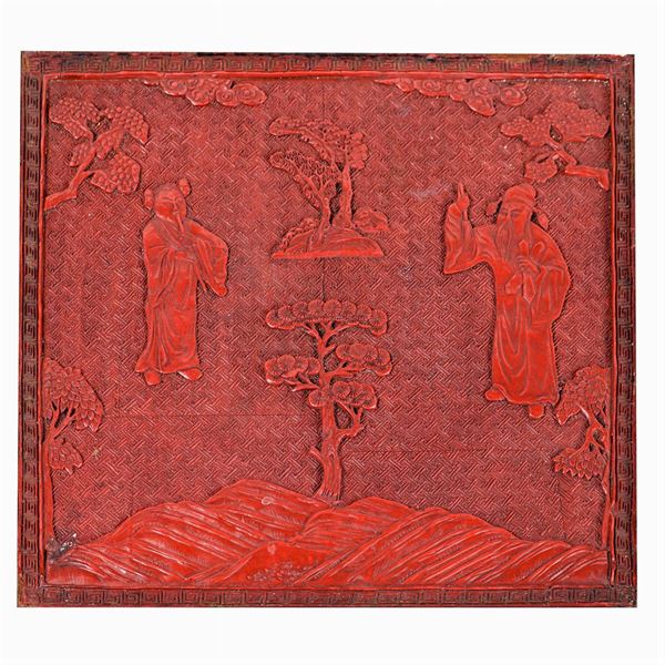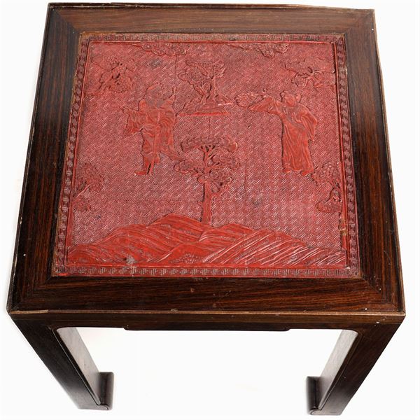 piani quadrati centrati da decorazioni in lacca rossa raffiguranti personaggi ed elementi vegetali, lievi difetti, 46x42x42 cm.