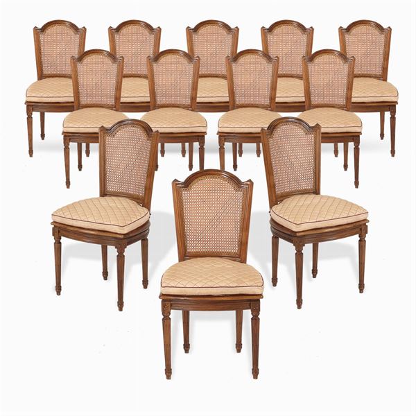 struttura in legno massello, sedute e schienali in paglia di Vienna, complete di cuscini imbottiti in tessuto, h. 98 cm.