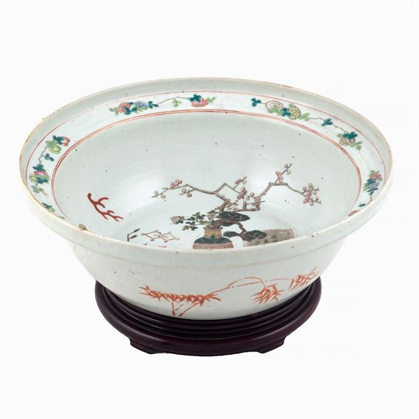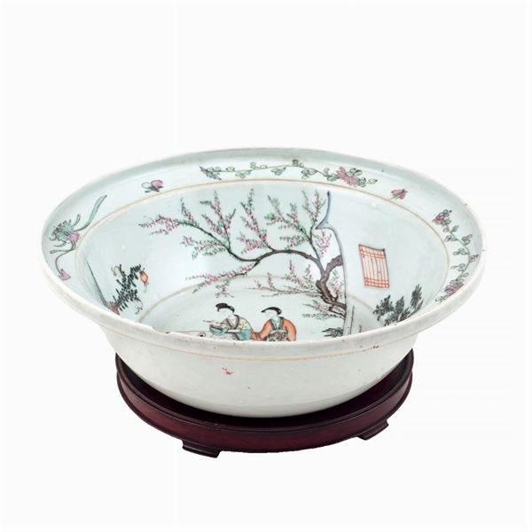 decorati in policromia con elementi floreali e scene di genere, poggianti su basi circolari in legno, un bacile marchiato sotto la base, difetti, h. 13 cm. - d. 36 cm.