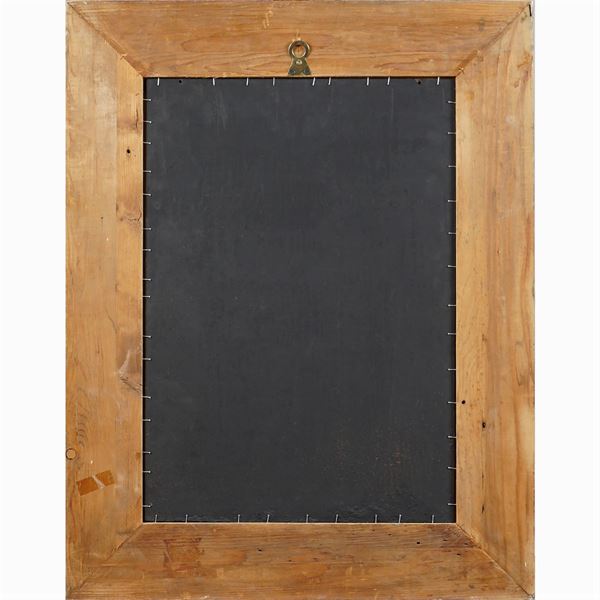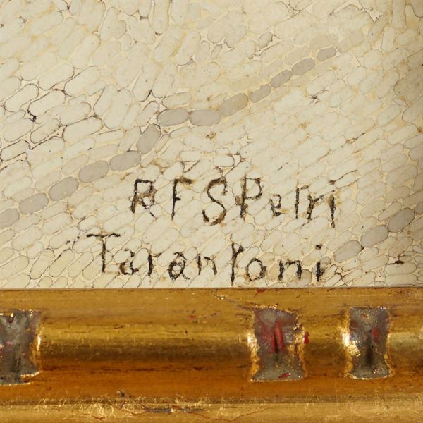 placca rettangolare in micromosaico raffigurante contadino in abiti tipici della campagna romana, firmato RFSPetri Tarantoni in basso a destra, entro cornice in legno dorato, 57x40 cm.