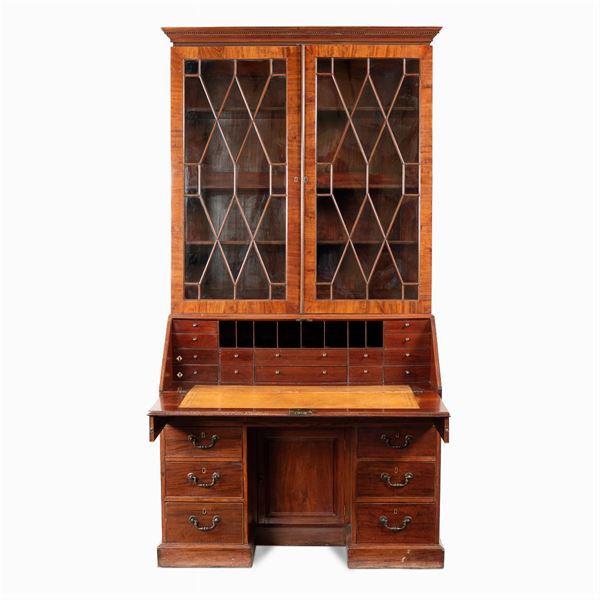 parte superiore con fronte a due sportelli a vetri, parte inferiore con fronte a ribalta con all'interno tiretti e scomparti vari e sette cassetti sottostanti, difetti, 235x125x65 cm.