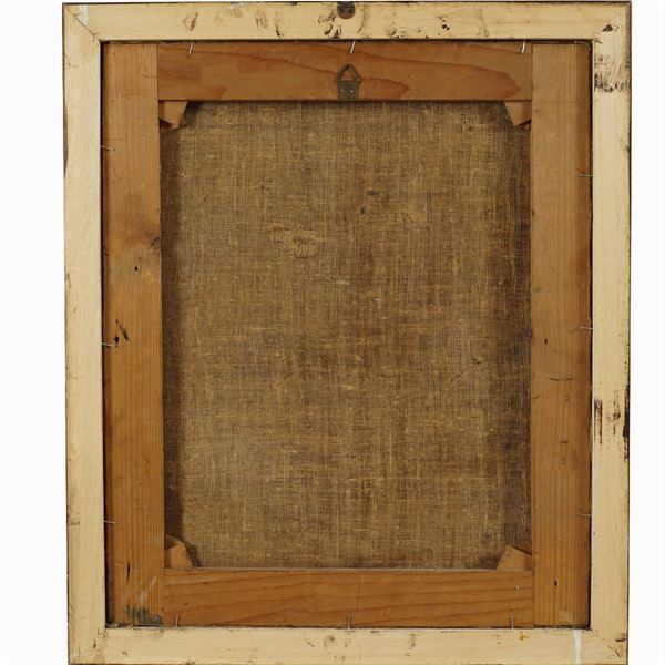 "Paesaggio con figure ed armenti", olio su tela, entro cornice, 58x49 cm.
