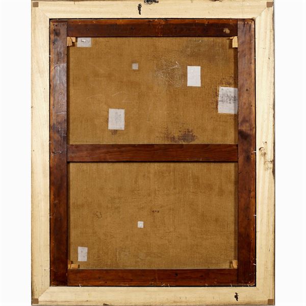"Mercato sul canale di Gent", olio su tela, entro cornice, 111x86 cm.