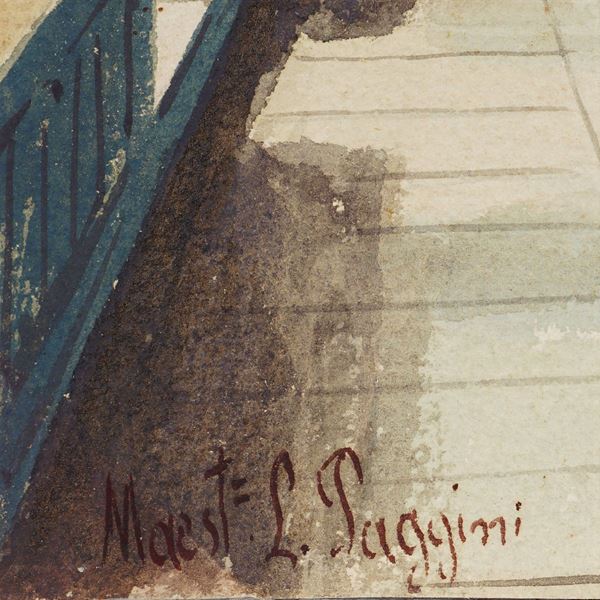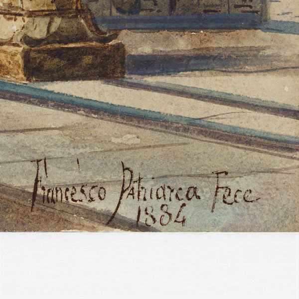 "Cortile di un camposanto", acquarello su carta, reca firma e data in basso a destra "Francesco Patriarca fece 1884", entro cornice, 35x48 cm.