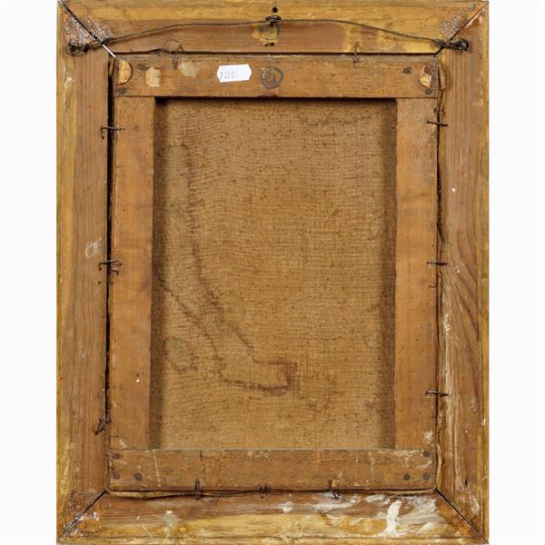 "Incontro galante alla fontana", olio su tela, entro cornice in legno dorato, 32x24,5 cm.