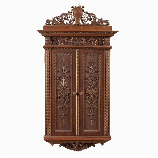 "Madonna con Bambino", trittico olio su tavola, siglato FV in basso a destra, ai lati pergamene con il Padre Nostro e l'Ave Maria, 88x77x10 cm.
