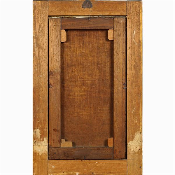 "Madonna con Bambino, San Giuseppe e San Filippo Neri", olio su tela, entro cornice in legno dorato, 45x24 cm.