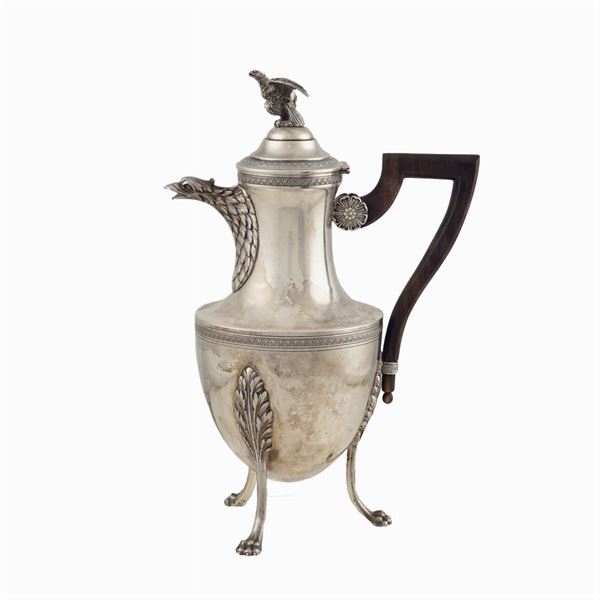 corpo piriforme inciso e cesellato con motivi di palmette Impero, presa del coperchio e becco a foggia di aquila, manico sagomato in legno, peso 865 gr., h. 30,5 cm.