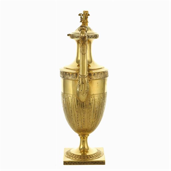 orafo Vincenzo Belli, corpo liscio di forma piriforme cesellato con foglie lanceolate greche e palmette, versatoio a foggia testa di grifone, manico in bronzo brunito raffigurante un levriero, bolli di garanzia dello Stato Pontificio, h. 26 cm. Bibliografia: Costantino Bulgari - Argentieri, gemmari e orafi d'Italia - Lorenzo del Turco Roma, parte prima, pag.121 tavola 8 dove sono illustrati disegni preparatori di suo padre Pietro, pag. 129 bollo n° 246 utilizzato dal maestro fino al 1859 data della sua morte, peso 534 gr.
