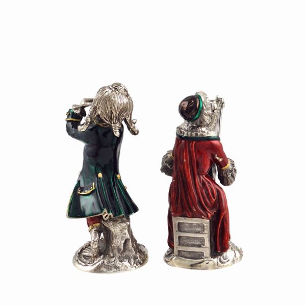 raffiguranti scimmie musicanti, firmate Cesare Cattaneo, Venezia, peso complessivo 708 gr., h. 11 cm.
