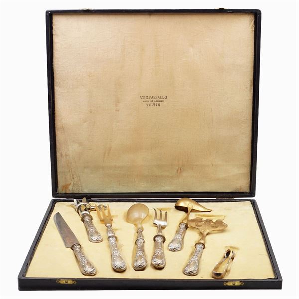 sbalzato e cesellato con motivi vegetali, una pinza in metallo argentato entro custodia con difetti, 5x41x38 cm.