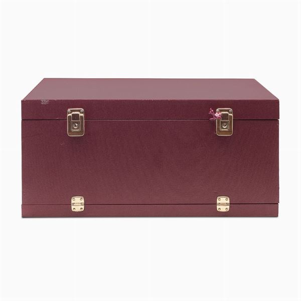 orafo Gustave Leroy, composto da: 36 forchette, 18 cucchiai, 36 coltelli, 18 forchette da pesce, 18 coltelli da pesce, 18 cucchiai medi, 12 forchette da crostacei, 18 forchette da frutta, 36 coltelli da frutta, 18 cucchiaini da the, 11 posate da portata, 4 posate per arrosto, entro custodia a scomparti, peso 9100 gr. circa, 24x52x32 cm.