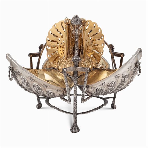 sbalzata e decorata con motivi floreali e vegetali, entro sostegno sagomato poggiante su tre piedini ferini, interno in vermeil traforato, peso 1763 gr., 24x25 cm.