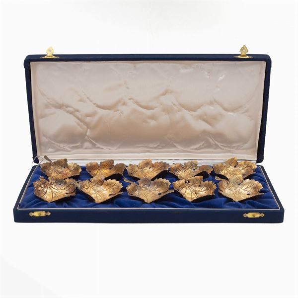 orafo Franco Sacchi, Firenze, corpi a foggia di foglia, realisticamente incise e cesellate, entro custodia, peso 220 gr., 2x8x5,5 cm.