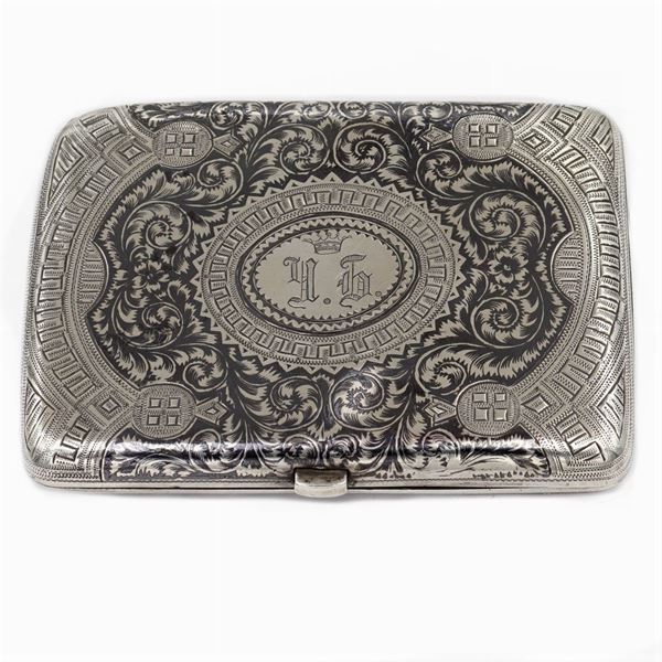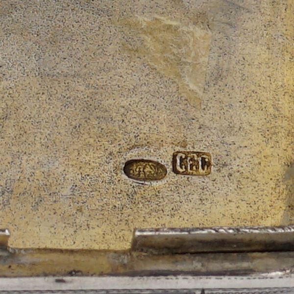 corpo cesellato con motivi vegetali e geometrici, coperchio centrato da una troika, 2,5x9x6,5 cm., peso 125 gr.