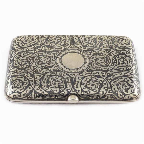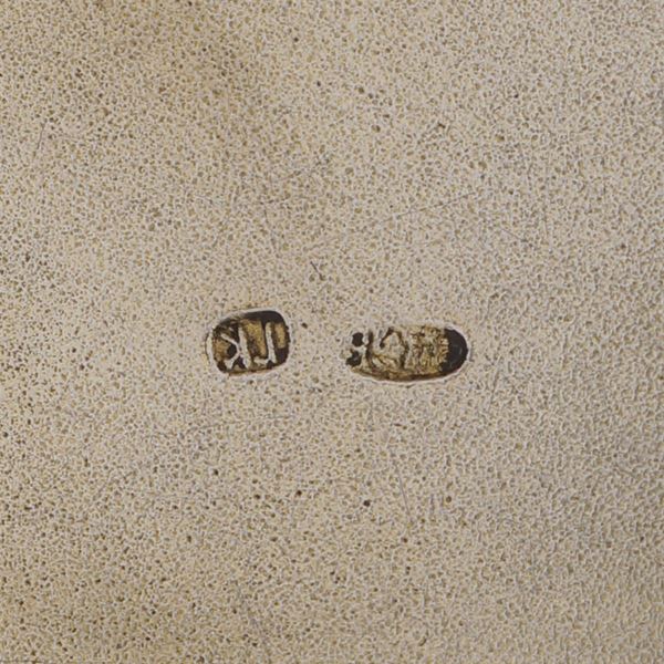 corpo inciso a raffigurare una Troika e ricchi decori vegetali, punzoni territoriali e di garanzia impressi all'interno,