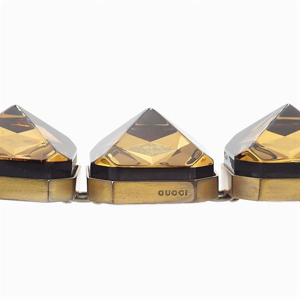 realizzata in metallo dorato e resina tagliata a motivo geometrico, lunghezza 35 cm.