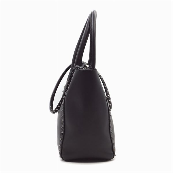 realizzata in pelle nera, decorata con borchie in metallo, chiusura a incastro in metallo, tracolla a spalla amovibile e doppi manici, interno ad uno scomparto con tasche di cui una cerniera, buone condizioni Completa di custodia in tessuto, 27x26x16 cm.