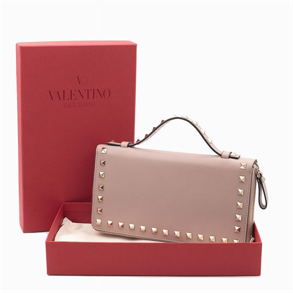 realizzato in pelle rosa Valentino decorato con borchie in metallo, manigliotto a mano, interno a quattro tasche, portamonete, quindici fessure portacarte e tasca amovibile per smartphone, chiusura a cerniera
