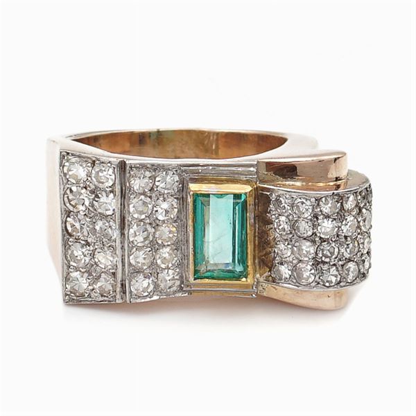 smeraldo taglio ottagonale ct 0,90 circa, ai lati diamanti taglio brillante ct 1 circa, misura 14,5, peso 7,9 gr.