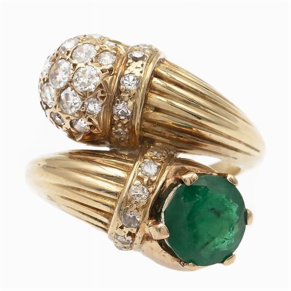 Anello contrarié in oro giallo 18kt con smeraldo e diamanti