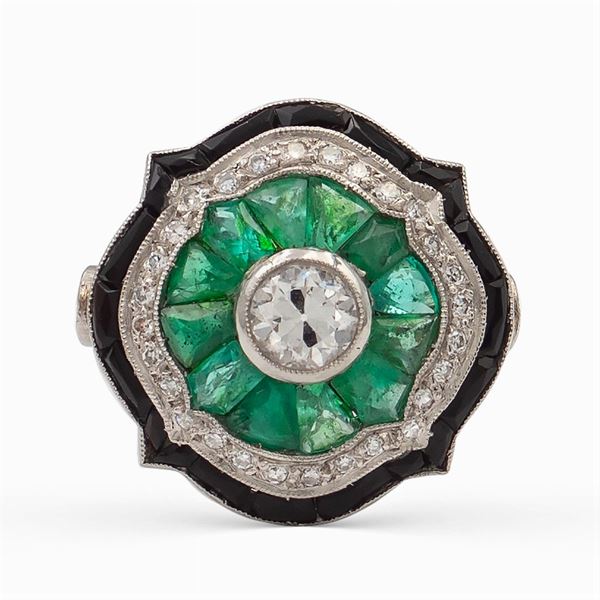 ct 0,40 circa contornato da smeraldi taglio tappered, diamanti taglio brillante e sezioni in onice nero, misura 15, peso 8,2 gr.