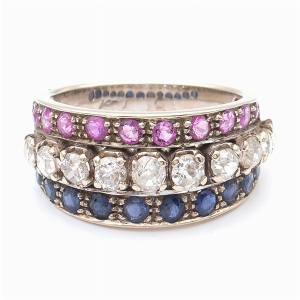 rivière centrale con diamanti taglio brillante antico ct 0,80, circa ai lati rubini e zaffiri tondi, misura 18, peso 9,3 gr.