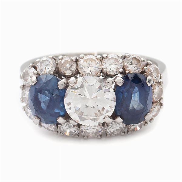 centrato da un diamante taglio brillante ct 1,35 circa colore H - purezza VS, ai lati due zaffiri taglio ovale (lievi difetti) e diamanti taglio brillante ct 1,80 circa (uno con difetti) colore G/I - purezza VS/SI, misura 17